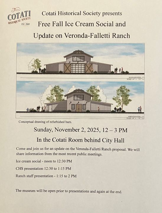 On Sunday, November 2, Cotati Historical Society is sponsoring an ice cream social from 12 - 12:30, then presentations about the Veronda-Falletti Ranch with updates from CHS and Veronda-Falletti Ranch staff. This event will take place in the Cotati Room behind City Hall between 12 and 3 PM. The Museum will also be open.